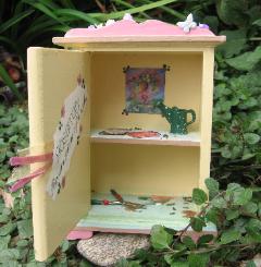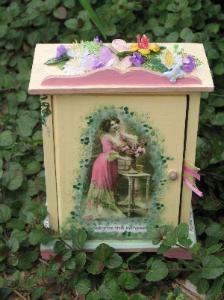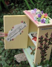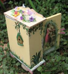 | The Garden Shed Shrine is an homage to those of us who love our gardens, and love gardening. The front is decorated with a vintage copy homemaker arranging a vase of flowers. The entire Shrine is covered with hand painted flora and fauna. Decoupaged throughout are scientific names of plants and herbs, and little quotes here and there. The Shrine is decorated with silk flowers, butterflies, a birdhouse, and glitter, glitter, glitter! Inside is a delightful tableaux of tiny gardening staples, including a little portrait of an angel. $45 |